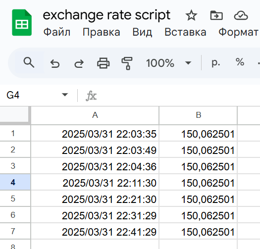 On loodnud google tabel, kuhu iga 10 minutit on sisestatud valitud vahetuskurss ja kellaaeg.