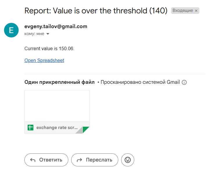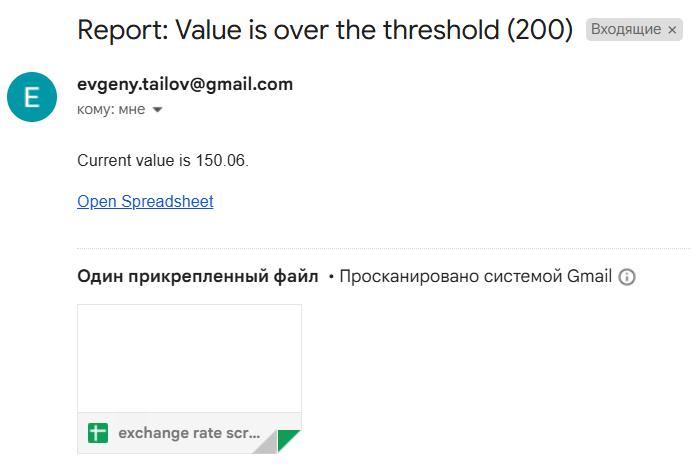 htmlBody: `<p>Current value is ${values[0][1].toFixed(2)}.</p><p><a href="${ss.getUrl()}">Open Spreadsheet</a>`, // e-kirja sisu koos praeguse väärtusega ja lingiga google tabelile