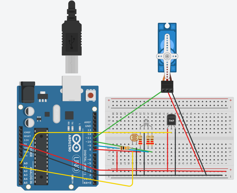Süsteem peab suutma juhtida servomootorit temperatuurimuutuse alusel ning lülitada valguse sisse või välja vastavalt valgustugevusele, kasutades fototakistit.