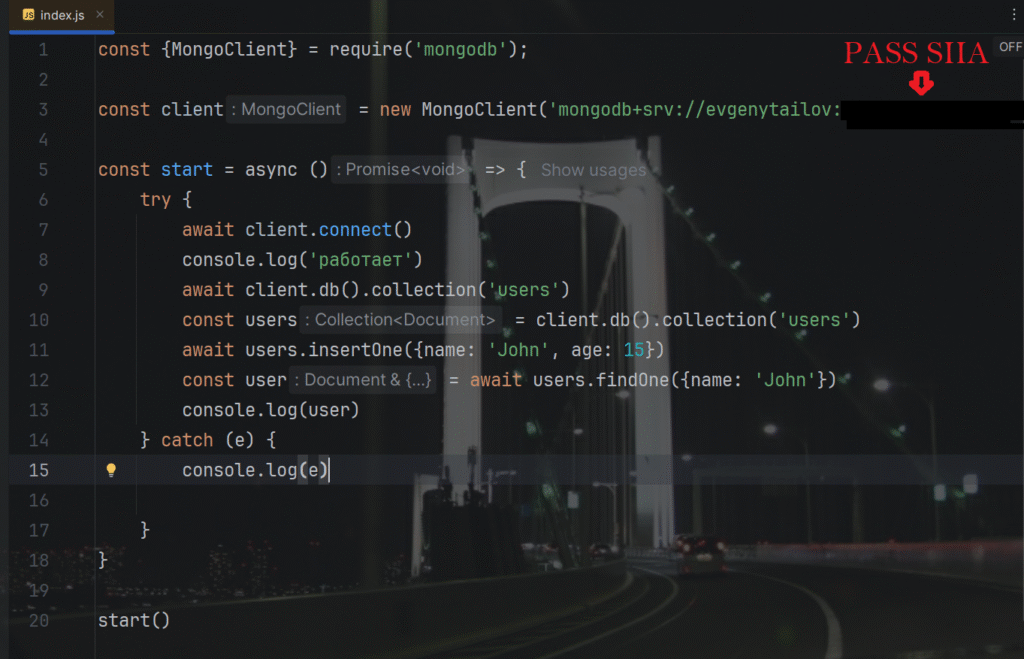 Loo uus fail index.js ja sisesta eelmisel kopeeritud ühenduselause new MongoClient sõnes, veel sisesta oma eelmisel kopeeritud salasõna!