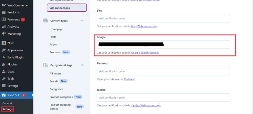 Lähed wp-admin lehele, otsid vasakust menüüst lehekülg Yoast SEO -> Settings -> General -> Site connections -> Google ja sisestad kooperitud kood