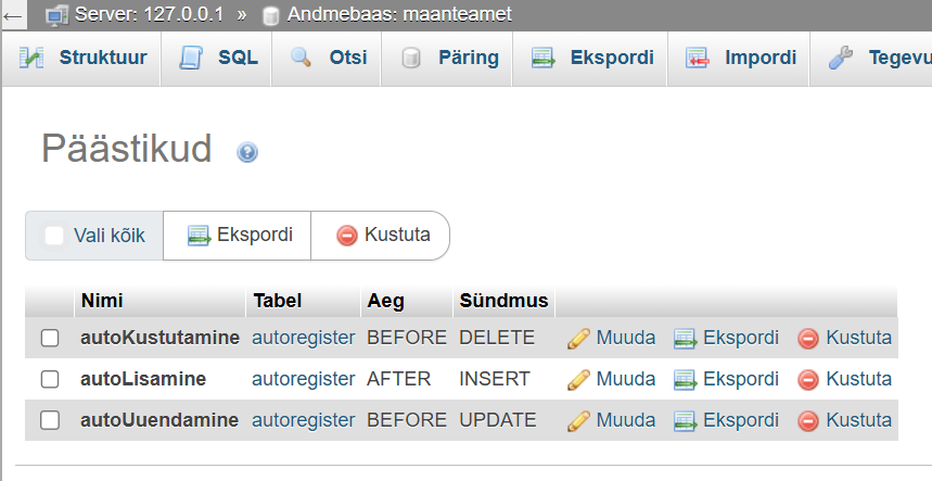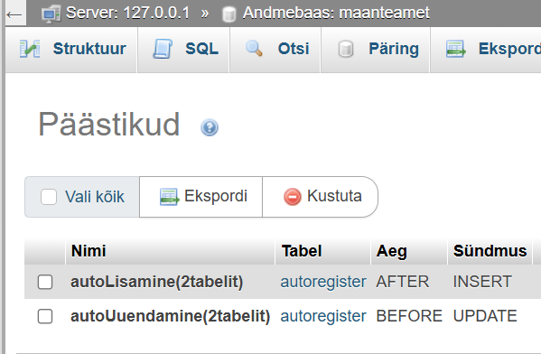 [XAMPP] Ühe tabeli triggeri loomine harjutus