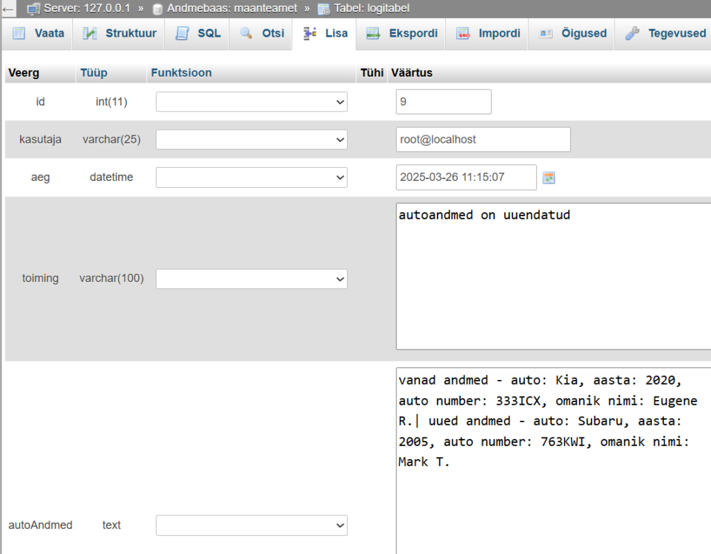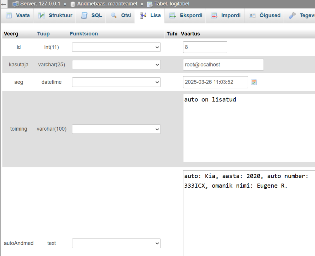 INSERT INTO logitabel(aeg, toiming, autoAndmed, kasutaja)
