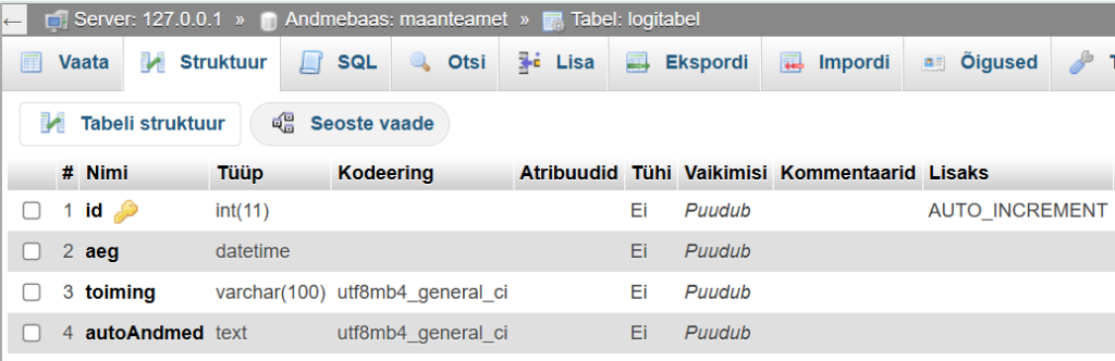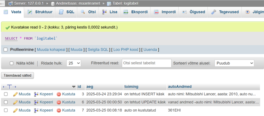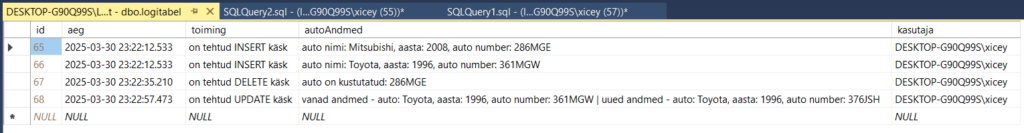 Tehtud tegevused logi tabelis