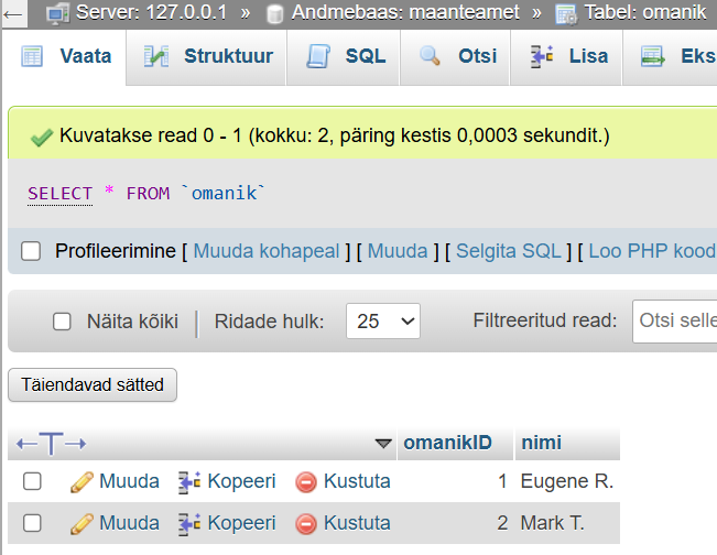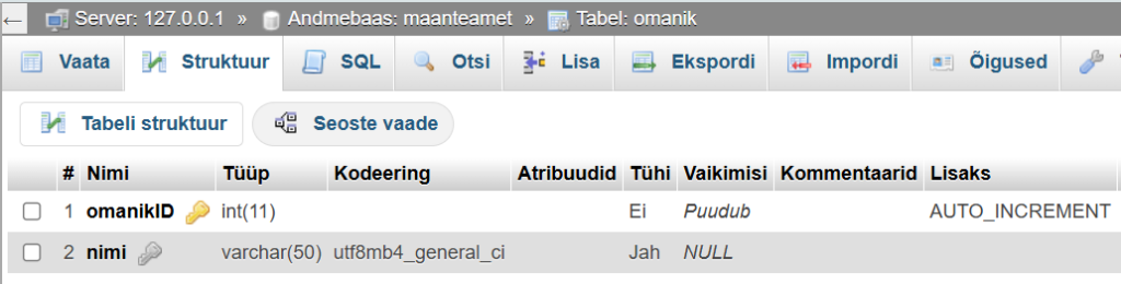 [XAMPP] Harjutus kahe tabelite seosete (on loodud tabel 'omanik')