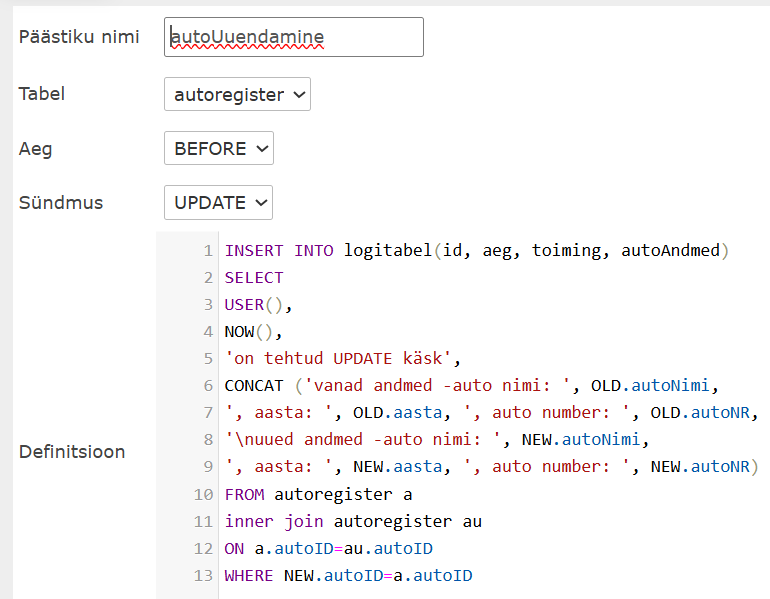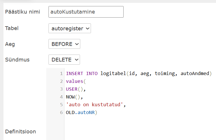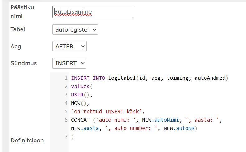 CREATE TRIGGER autoLisamine